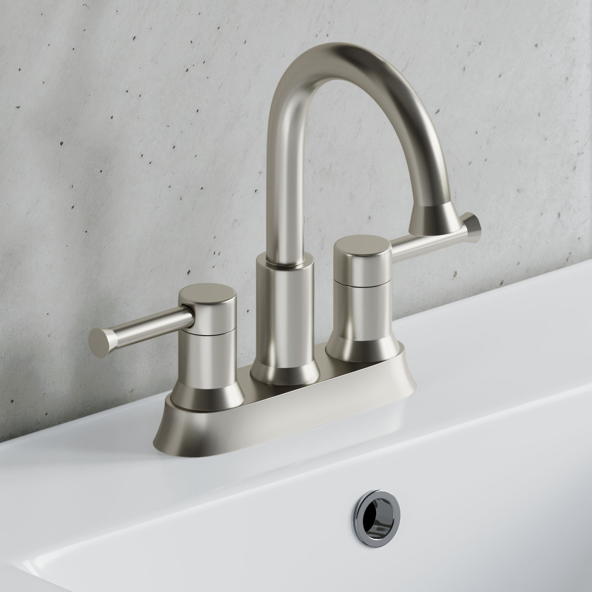 Dowell 8001 002 two handle bathroom faucet with brass waterway and ceramic disk cartridge requires 3 hole sink application. Available with brushed nickel finish.