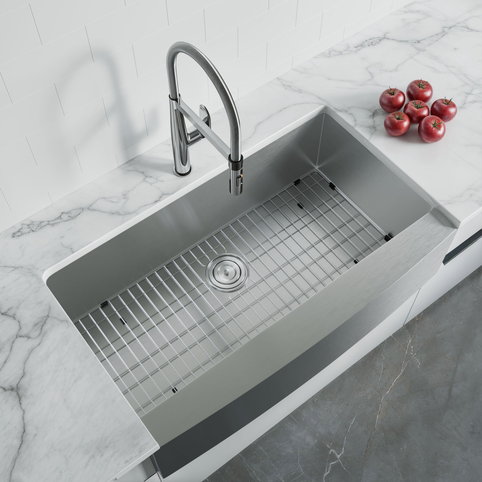 The Dowell 6002 Series 35-7/8" L x 20-3/4" W Handcrafted Apron-front Farmhouse Undermount Kitchen Sink offers a professional style for the home. Crafted from premium 18-gauge, 304 stainless steel, its scratch-resistant satin finish adds both style and resilience, keeping the sink beautiful through years of daily use. Designed with an 10" deep basin, it provides generous space for large cookware, baking sheets, and everyday dishwashing. To ensure a quieter kitchen experience, the sink is fully undercoated and fitted with sound-deadening pads, reducing noise and vibration.