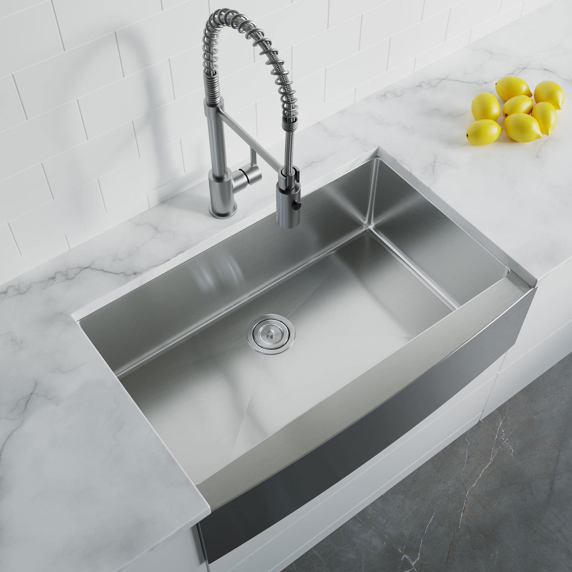 The Dowell 6008 Series 32-7/8" L x 20-3/4" W Handcrafted Apron-front Farmhouse Undermount Kitchen Sink combines modern elegance with professional-grade performance. Constructed from premium 16-gauge 304 stainless steel and finished in a refined satin sheen, this sink features small-radius corners that maximize usable space while making cleaning easier. Its generous 10″ deep basin easily accommodates large pots, trays, and bakeware—perfect for busy home kitchens. Every sink comes complete with a stainless steel grid and strainer, adding both protection and convenience right out of the box.