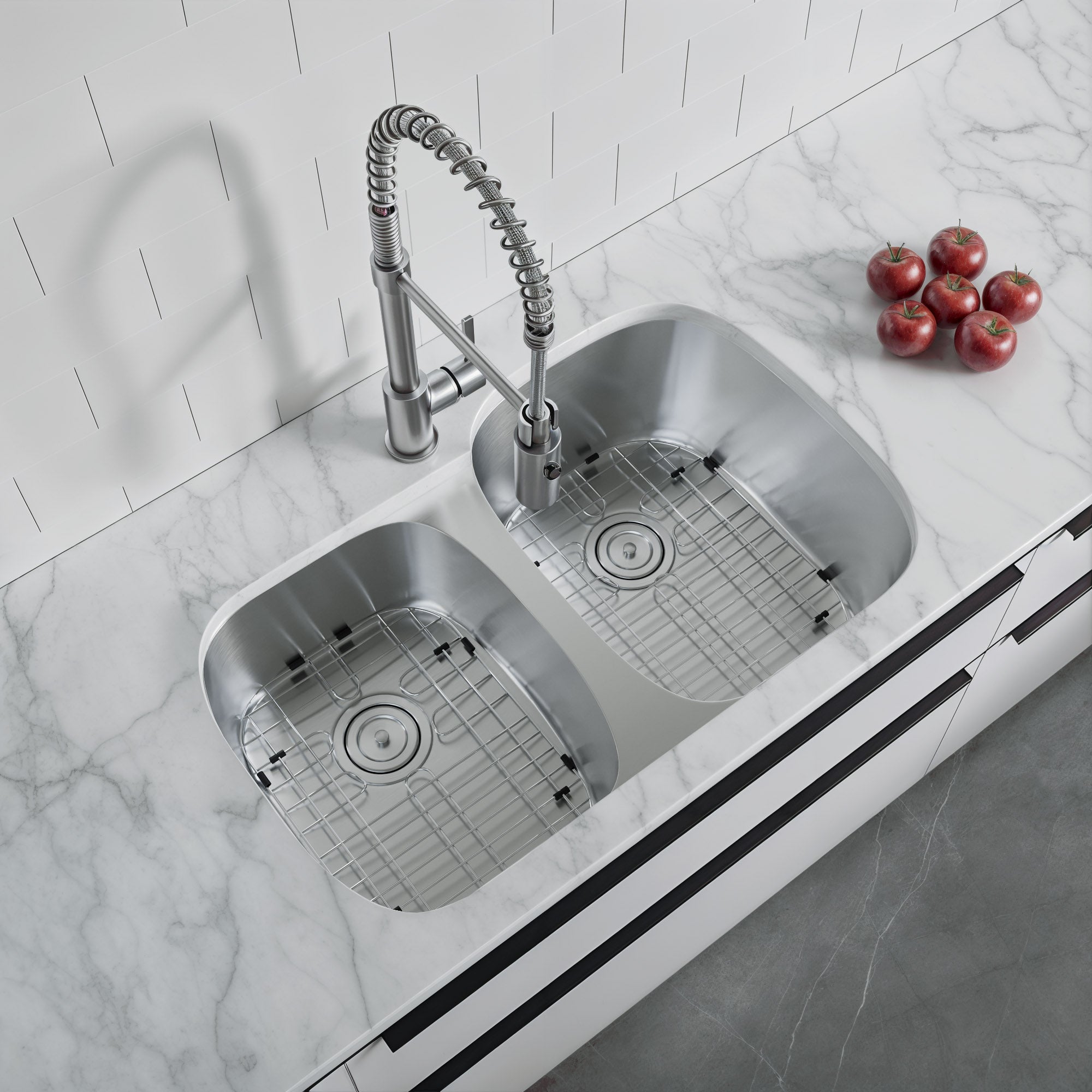 Dowell 6011 undermount double kitchen sink offers a professional style for the home with easy-to-clean small radius curved corners. Made of premium quality 18/16-gauge stainless steel with a satin finish, the double bowls (left bowl is 13-1/2"x16-3/8"x7" and the right bowl is 15-3/8"x18-5/8"x9"each bowl is 14"x16"x9") allow you to soak and clean large cookware and bakeware. This space-saving kitchen sink features a sound-absorption system that significantly reduces disposal and dishwashing noise. Includes installation template and all the hardware needed for installation.